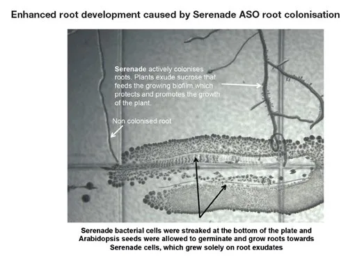 Roots colonised by Serenade ASO are denser and have more lateral roots and longer root hairs. This increased root surface area gives improved phosphorus uptake, availability of nutrients, water absorption and anchorage - all leading to stronger, healthier plants.